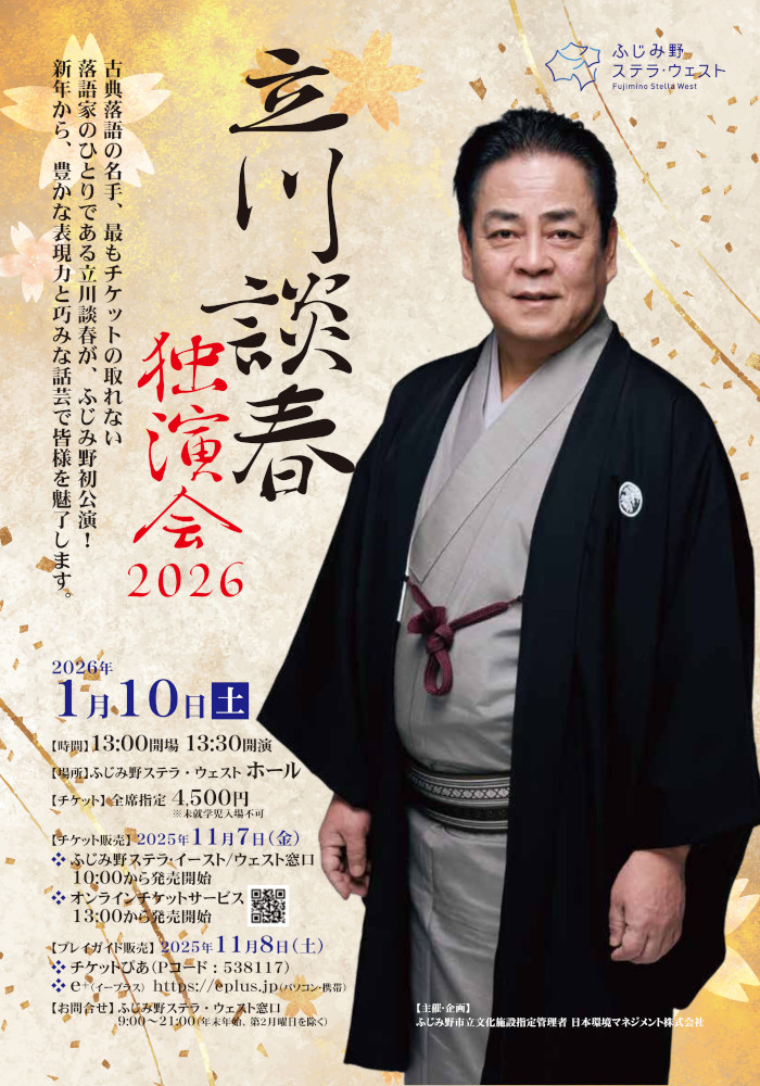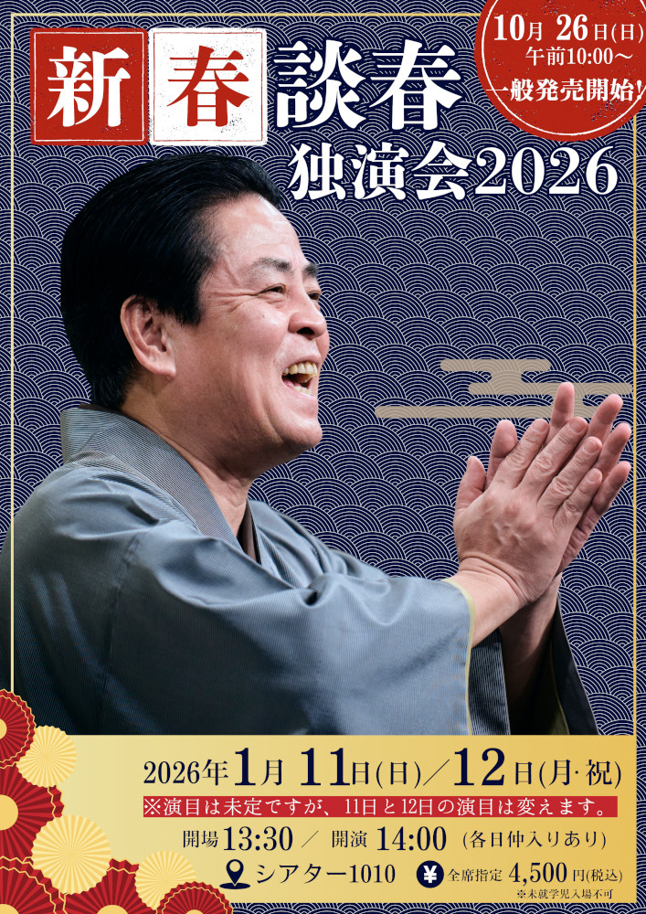 お知らせ 2026年1月11日(日)… 2026年1月11日(日)、12日(月祝)シアター1010での「新春談春独演会2026」の情報を掲載…. 2025年10月16日 お知らせ 2025年12月13日(土… 2025年12月13日(土)新潟県民会館での「立川談春独演会」の情報を掲載しました。 2025年10月12日 お知らせ 2025年12月9日~18… 平日昼公演では都合が悪い方のために夜公演も行う立川談春独演会2025 年末特別編 2025年10月09日 お知らせ 2026年7月18日(土)… 2026年7月18日(土)ロームシアター京都 サウスホールでの「立川談春独演会」の情報を掲載しました…. 2025年10月05日 お知らせ 2026年6月14日(日)… 2026年6月14日(日)兵庫県立芸術文化センター 阪急 中ホールでの「立川談春独演会」の情報を掲載…. 2025年10月05日 お知らせ 2026年5月6日(水)ア… 2026年5月6日(水)アクリエひめじ中ホールでの「立川談春独演会」の情報を掲載しました。 2025年10月05日 お知らせ 2026年4月26日(日)… 2026年4月26日(日)森ノ宮ピロティホールでの「立川談春独演会」の情報を掲載しました。 2025年10月05日 お知らせ 2026年3月7日(土)神… 2026年3月7日(土)神戸新聞松方ホールでの「立川談春独演会」の情報を掲載しました。 2025年10月05日 お知らせ 2026年1月10日ふじみ… 2026年1月10日ふじみ野ステラ・ウェストホールで「立川談春独演会2026」の情報を掲載しました。 2025年10月04日 お知らせ 2026年1月4日(日)蓮… 2026年1月4日(日)蓮田市総合文化会館ハストピアどきどきホールでの独演会「新春談春」の情報を掲載…. 2025年10月04日 次のページへ