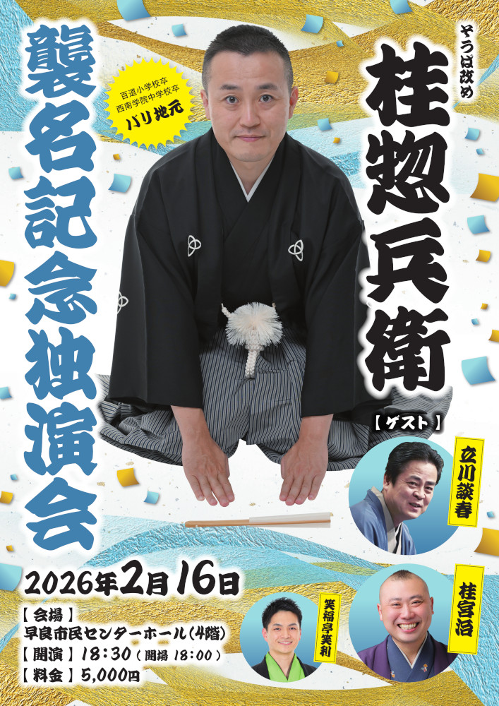 お知らせ 2025年11月29日 2026年2月16日(月)早良市民センターホールでの「桂惣兵衛 襲名記念独演会」の情報を掲載しました。 2026年2月16日(月)早良市民センターホールでの「桂惣兵衛 襲名記念独演会」の情報を掲載しました。 詳しくはこちら 前のページへ 次のページへ 一覧を見る