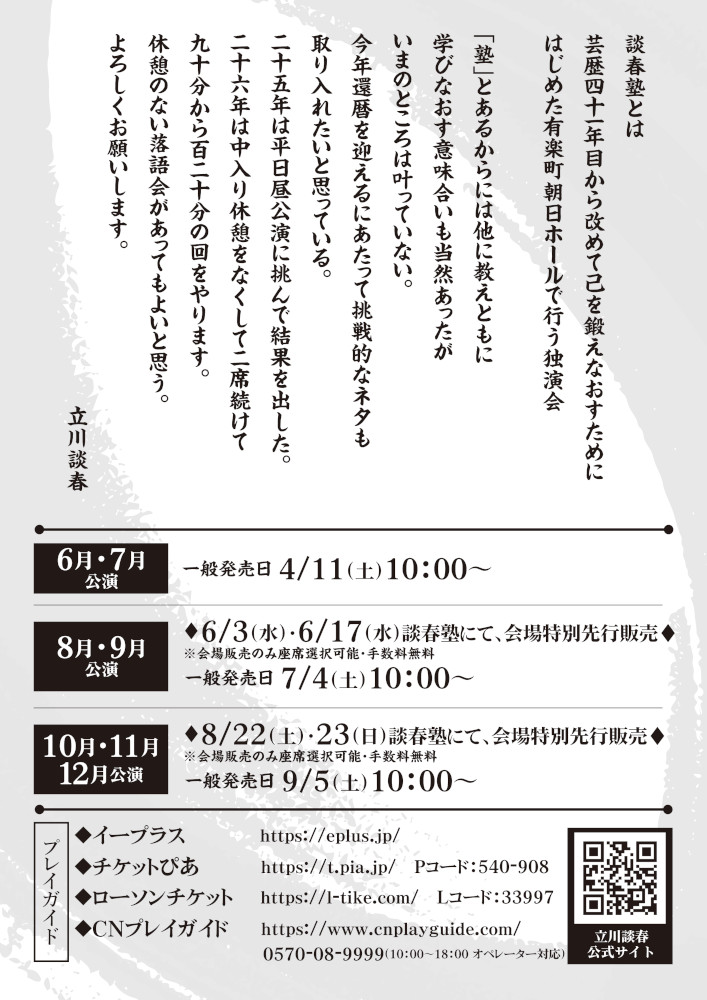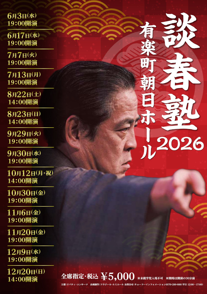 2026年6月~12月有楽町朝日ホールでの「談春塾2026」の情報を掲載しました。